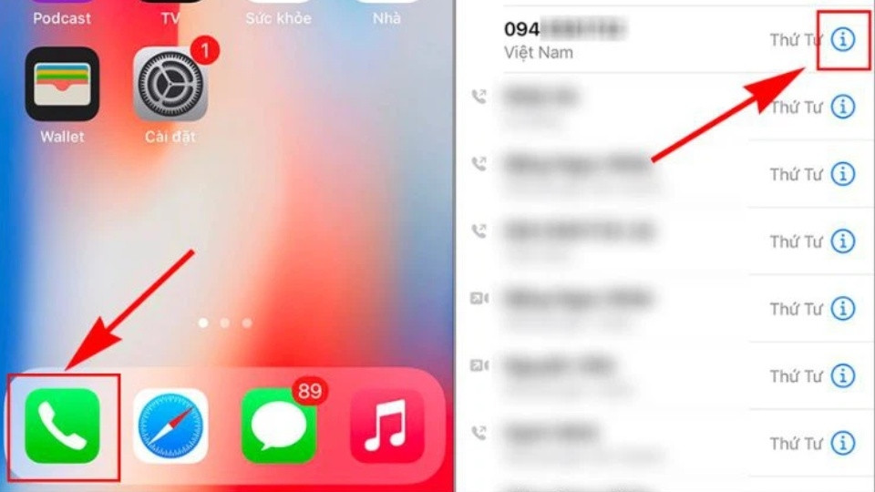 Đối với người dùng iPhone, cách chặn số điện thoại 0248 hoặc bất kỳ số lạ nào khác cũng tương tự và dễ dàng thực hiện. Bạn hãy mở ứng dụng “Điện thoại” trên thiết bị của mình. Tại giao diện chính, chọn mục “Gần đây” để xem danh sách các cuộc gọi đến và đi. Sau đó, tìm số điện thoại mà bạn muốn chặn và nhấn vào biểu tượng chữ “i” nằm bên phải của số đó để truy cập thông tin chi tiết.