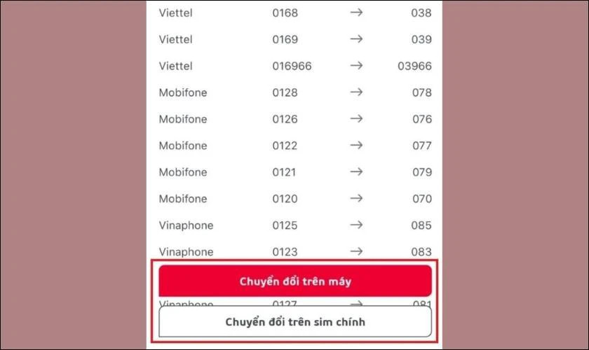 Khi truy cập vào chức năng chuyển đổi, ứng dụng My Viettel sẽ hiển thị danh sách các đầu số đã được chuyển đổi của các nhà mạng (trong trường hợp danh bạ của bạn có số của nhà mạng khác). Để cập nhật danh bạ trên điện thoại của mình, bạn sẽ có hai tùy chọn chính: Chuyển đổi trên máy (áp dụng cho các số đã lưu trong bộ nhớ điện thoại) hoặc Chuyển đổi trên SIM (áp dụng cho các số lưu trực tiếp trên thẻ SIM). Hãy chọn tùy chọn phù hợp với nhu cầu của bạn. Sau khi chọn, ứng dụng sẽ tự động quét và cập nhật các số điện thoại 11 số sang 10 số mới.