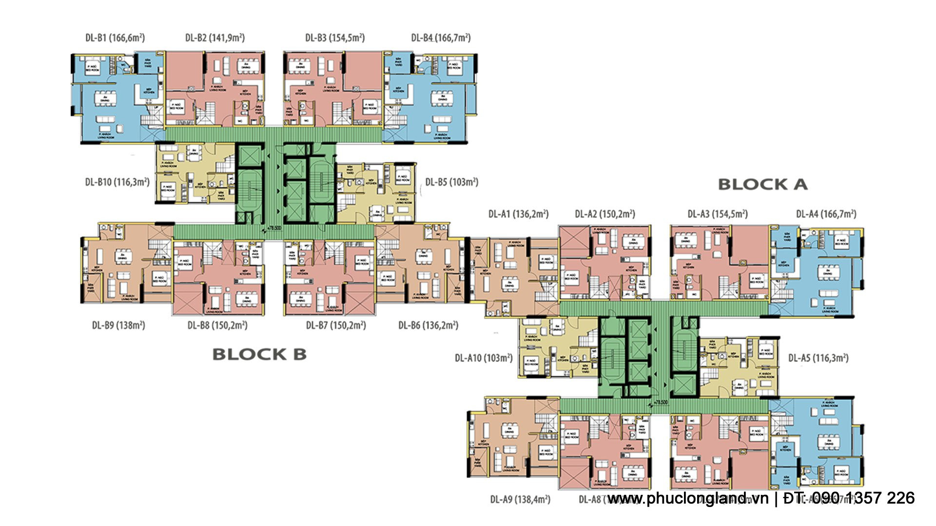 Dự án cung cấp các loại căn hộ 1 phòng ngủ (51,5m²), 2 phòng ngủ (71,6m² – 75m²), và 3 phòng ngủ (94,5m²), đáp ứng nhu cầu đa dạng của khách hàng.