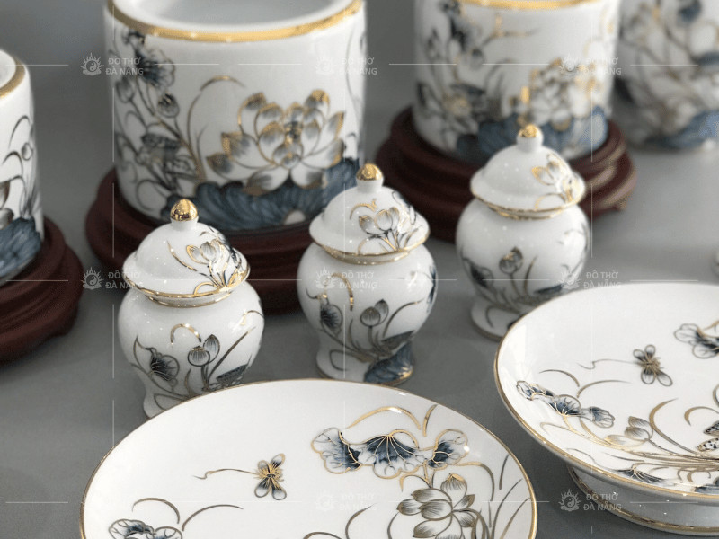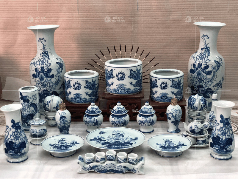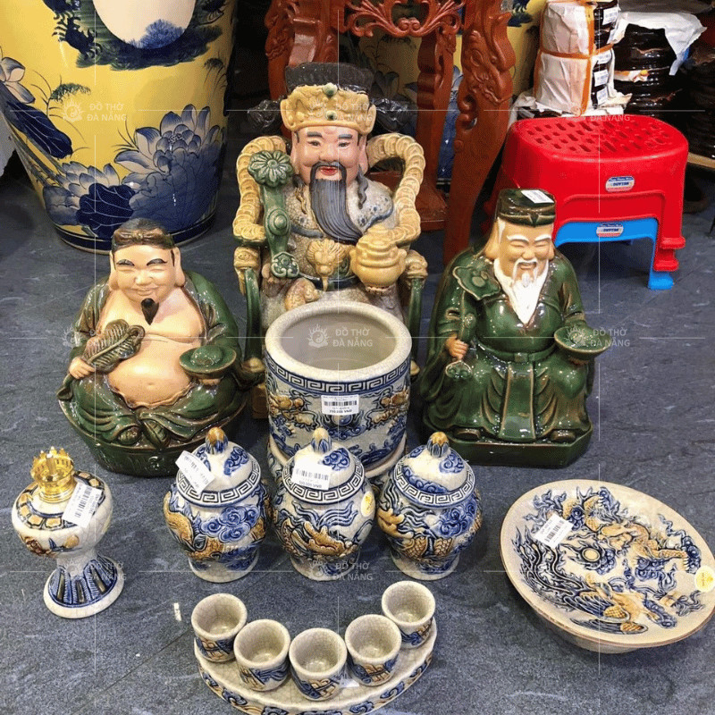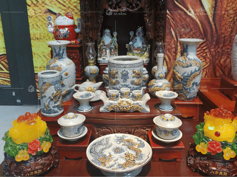 Đối với Bàn thờ Gia tiên: Thường đặt 2-3 hũ ở phía trước bát hương và sau mâm ngũ quả, xếp theo hàng ngang. Nếu không gian hẹp, có thể chỉ đặt hai hũ (gạo và muối, hoặc nước và muối) vẫn đảm bảo ý nghĩa. Bộ đồ thờ gốm sứ Bát Tràng thường đi kèm các chóe thờ có kích thước phù hợp, giúp gia chủ dễ dàng lựa chọn. Điều này tạo nên sự cân đối và hài hòa cho tổng thể ban thờ.