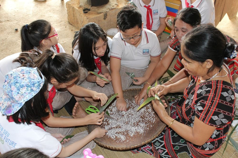 Bước vào làng dân tộc Khmer, không khí trở nên rộn ràng với trải nghiệm gói bánh tét, món bánh truyền thống không thể thiếu trong các dịp Tết của đồng bào. Du khách sẽ được hướng dẫn cách chọn lá chuối, sắp xếp nếp, nhân đậu xanh, thịt ba chỉ sao cho khi cắt bánh có hình tròn đẹp mắt. Từng món ăn không chỉ mang giá trị ẩm thực, mà còn chứa đựng câu chuyện văn hóa, truyền thống của mỗi dân tộc, để mỗi người khi rời đi đều lưu giữ những dư vị khó quên về ẩm thực các dân tộc Việt Nam.