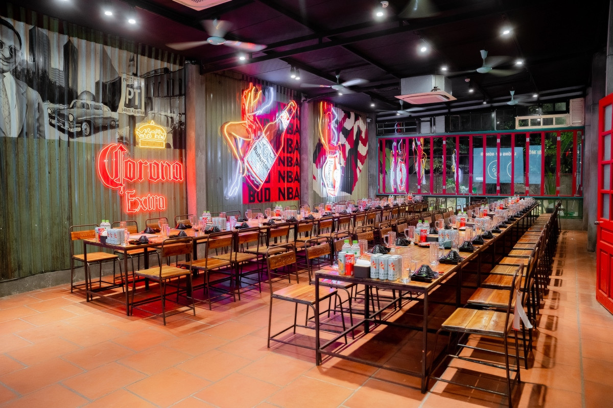 Không gian nội thất hiện đại và trẻ trung bên trong Quán Nhậu Tự Do, với phong cách trang trí độc đáo.