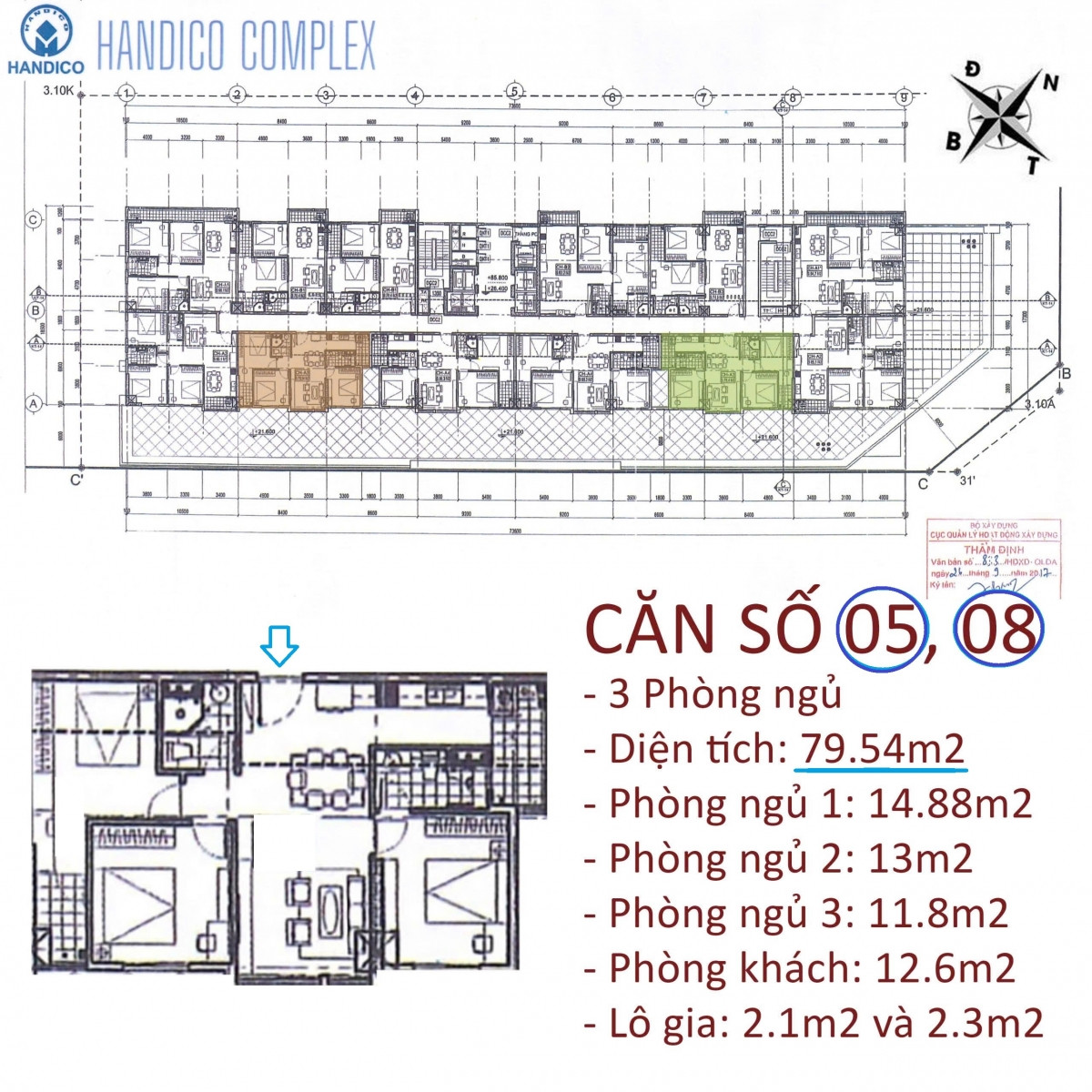 Mặt bằng căn hộ 3 phòng ngủ 79m2 dự án Handico Complex 33 Lê Văn Lương