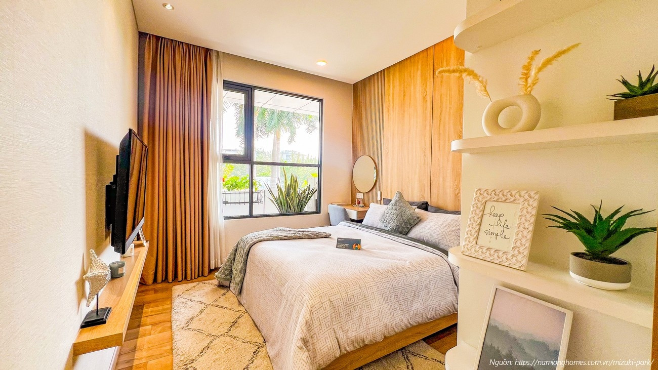 Phòng ngủ chính căn hộ mẫu 58m2 Mizuki Park