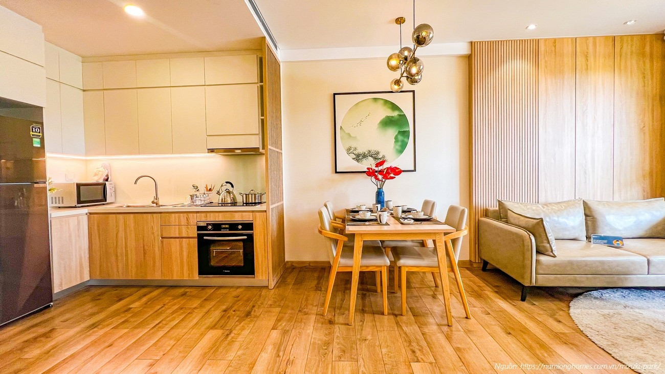 Phòng khách và bếp liền mạch căn hộ mẫu Mizuki Park 58m2