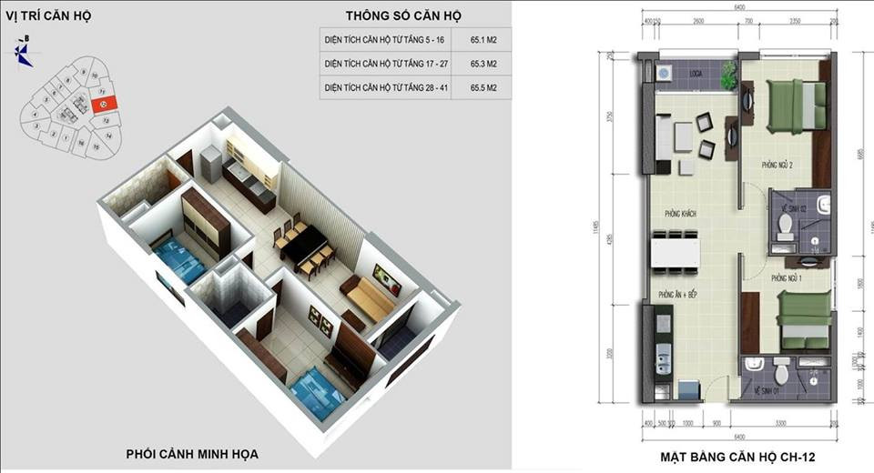 Thiết kế mặt bằng căn hộ 2 phòng ngủ 65m2 tại Tòa B Vinaconex 2