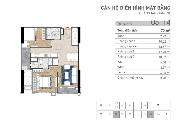 - Diện tích căn hộ: 72m2 (2PN) – 119m2 (3PN) – 144m2 (3PN Duplex) – 202m2 (Penthouse)