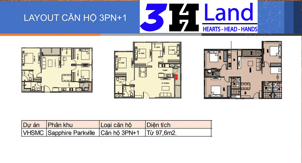 Riêng căn hộ 3 phòng ngủ +1 với diện tích từ 94m2 đến 97m2, chỉ có ở phân khu Sapphire Parkville (tòa S4). Đây là các căn góc được thiết kế rộng rãi, đẳng cấp, không thua kém các dự án cao cấp khác của Vinhomes. Bao gồm ba phòng ngủ, ba nhà vệ sinh, phòng khách, bếp, ban công rộng và logia, tạo không gian sinh hoạt chung lý tưởng. Loại hình này phù hợp cho đại gia đình hoặc những văn phòng, cơ sở kinh doanh có nhu cầu không gian lớn khi tìm mua căn hộ Vinhomes Smart City, với giá từ 6 tỷ đến 8 tỷ đồng.