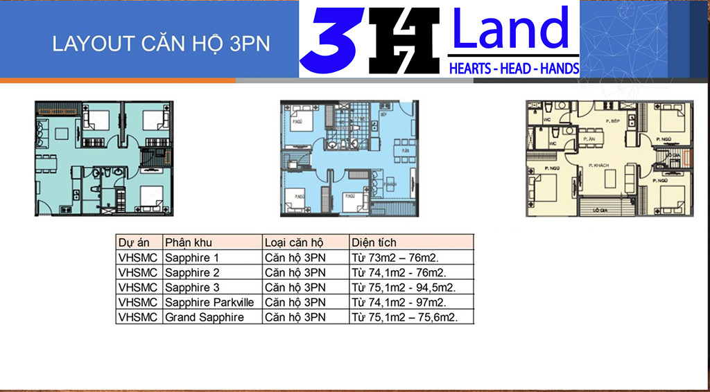Các căn 3 phòng ngủ có diện tích từ 73m2 đến 95m2, xuất hiện ở khắp các phân khu. Thiết kế gồm ba phòng ngủ, hai nhà vệ sinh, phòng khách, bếp, ban công rộng và logia, tạo không gian sinh hoạt chung rộng rãi, tận dụng tối đa công năng. Loại hình này phù hợp cho gia đình đa thế hệ (2-3 thế hệ) hoặc dùng làm văn phòng, cơ sở kinh doanh nhỏ, với mức giá phổ biến từ 5.15 tỷ đến 6.5 tỷ đồng khi mua chung cư Vinhomes Smart City.