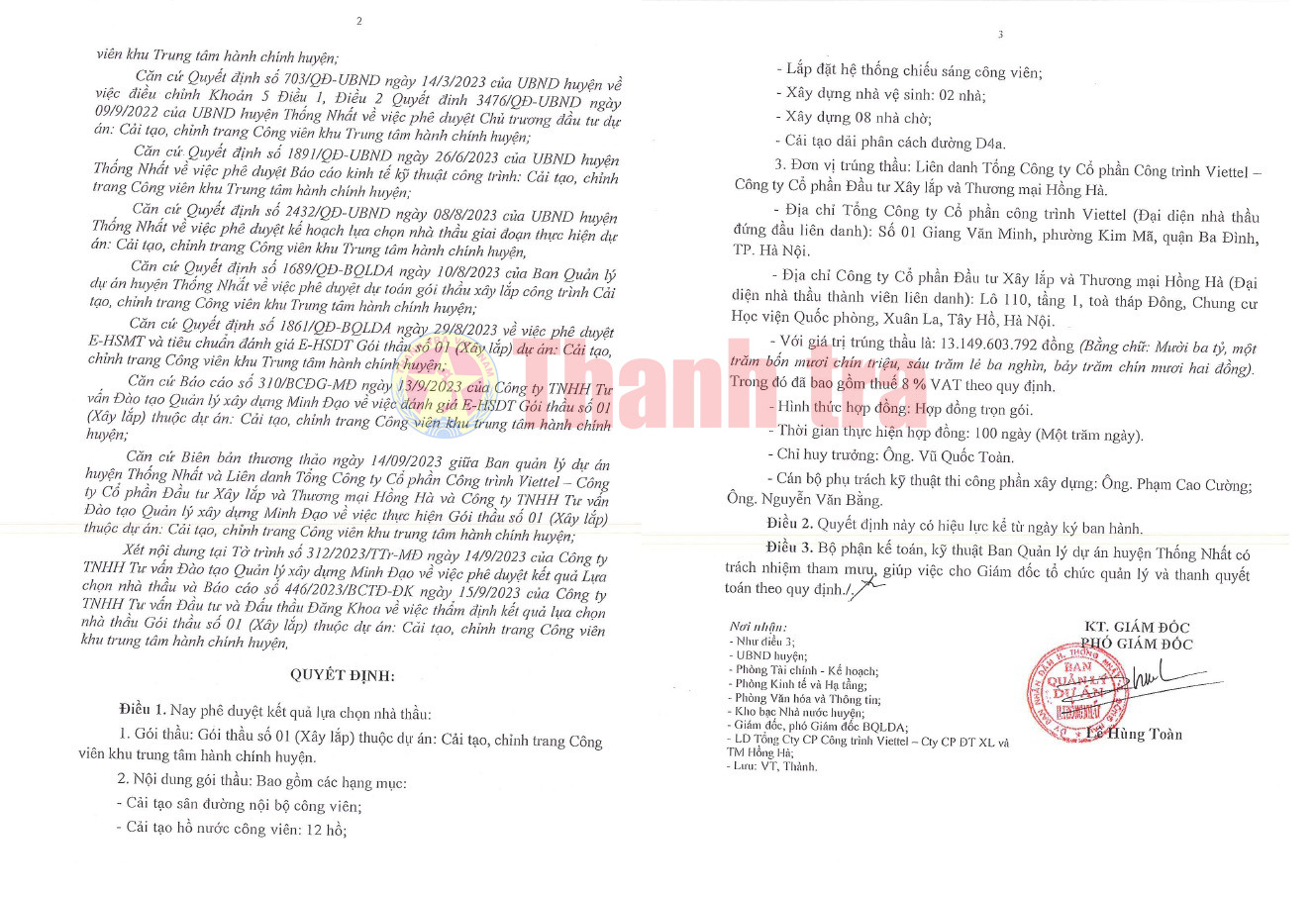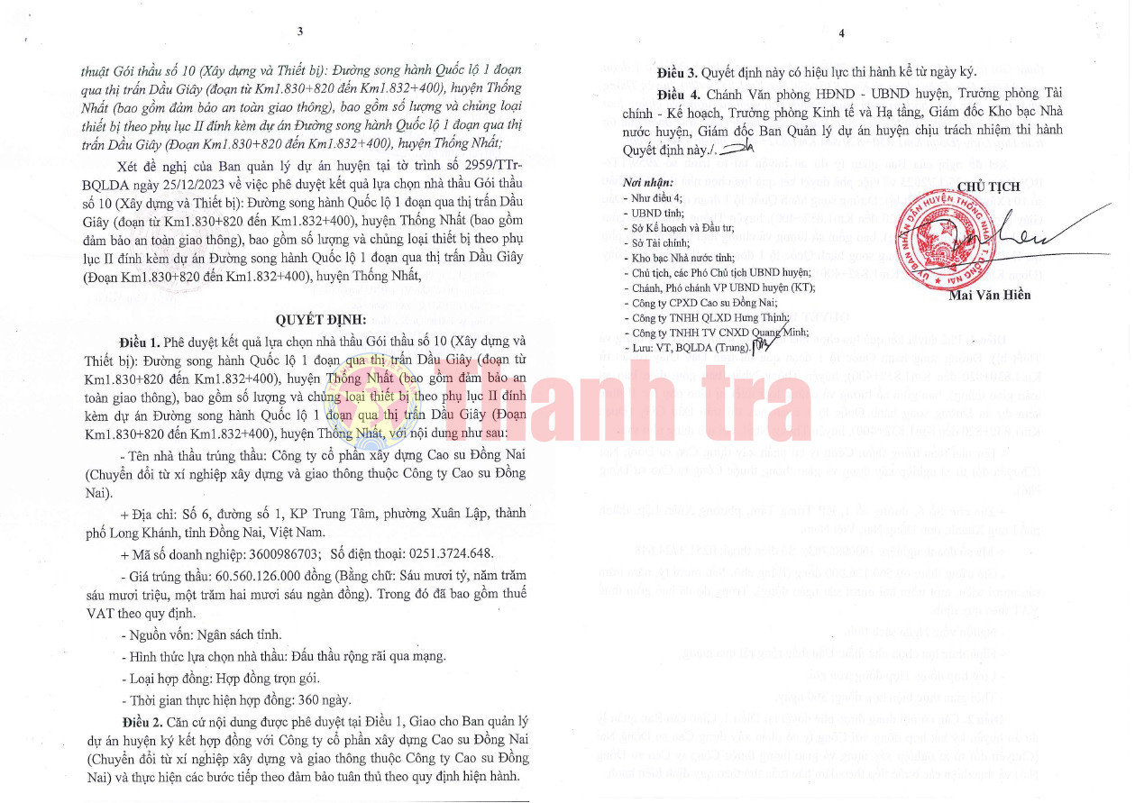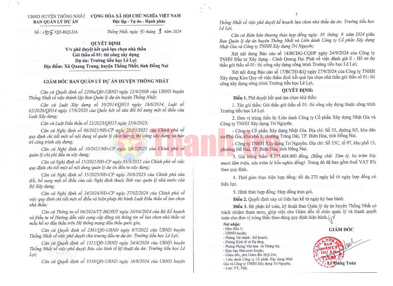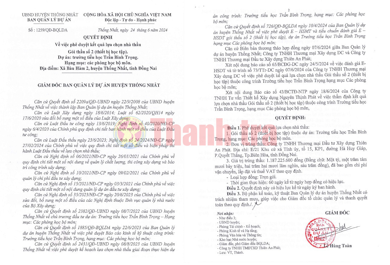 Tài liệu phê duyệt kết quả đấu thầu của Ban Quản lý Dự án Huyện Thống Nhất