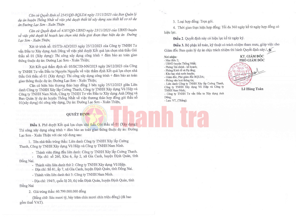 Văn bản phê duyệt gói thầu đường Lạc Sơn – Xuân Thiện của Phó Giám đốc Ban Quản lý Dự án Huyện Thống Nhất