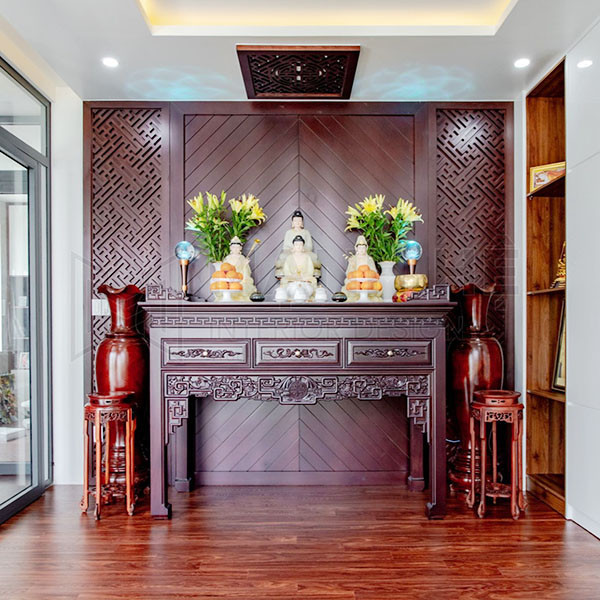 Trong không gian chung cư hạn chế, nhiều gia đình thường đặt bàn thờ Phật và bàn thờ gia tiên chung. Điều này hoàn toàn có thể chấp nhận được, miễn là có sự phân cấp rõ ràng: tượng Phật hoặc bài vị Phật nên đặt ở vị trí cao nhất, phía trên bàn thờ gia tiên. Có thể sử dụng các mẫu bàn thờ hai cấp hoặc bàn thờ tam cấp để phân tách rõ ràng, thể hiện sự tôn kính.