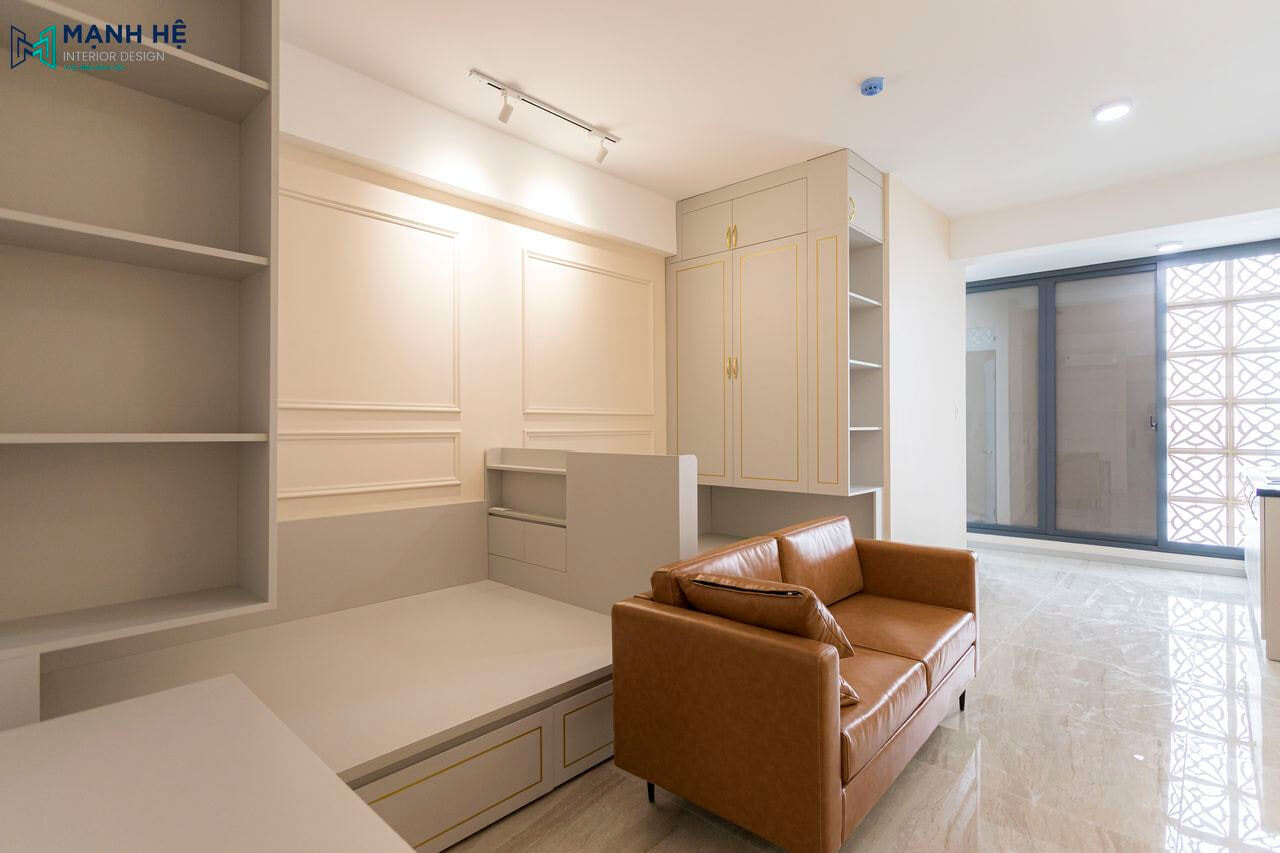Mẫu thi công nội thất căn hộ dịch vụ bằng gỗ công nghiệp với phòng khách liền bếp và phòng ngủ