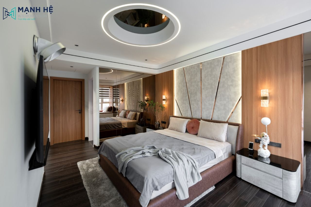Thi công nội thất phòng ngủ master căn hộ đầy đủ tiện nghi với giường ngủ và táp đầu giường