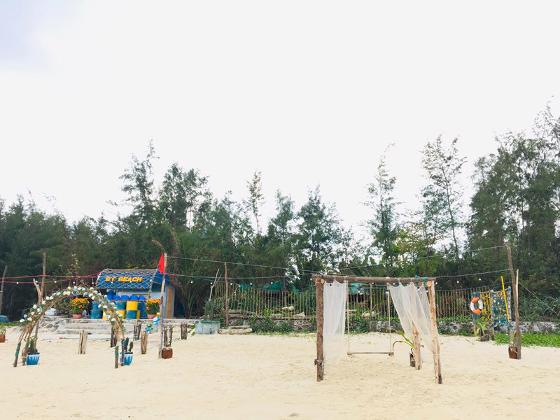 Chủ quán đã rất khéo léo trong việc tận dụng những vật liệu gần gũi với cuộc sống ngư dân như thúng, lưới đánh cá, dây thừng, mái chèo cũ, sao biển và vỏ sò để trang trí. Những tiểu cảnh sinh động này tạo nên vô vàn góc sống ảo ấn tượng. Một chiếc xích đu gỗ treo bằng dây thừng trên bãi cát, cổng hình vòm đầy hoa, dải đèn lồng làm từ lưới, hay “bức tường” sống ảo được trang trí bằng sao biển và ốc biển đủ màu sắc, tất cả đều góp phần tạo nên một không gian cổ tích giữa thiên nhiên. Những chiếc rèm xanh bay trong gió càng làm tăng thêm vẻ lãng mạn, thu hút không chỉ các bạn trẻ mà còn cả các cặp đôi đến chụp ảnh cưới.