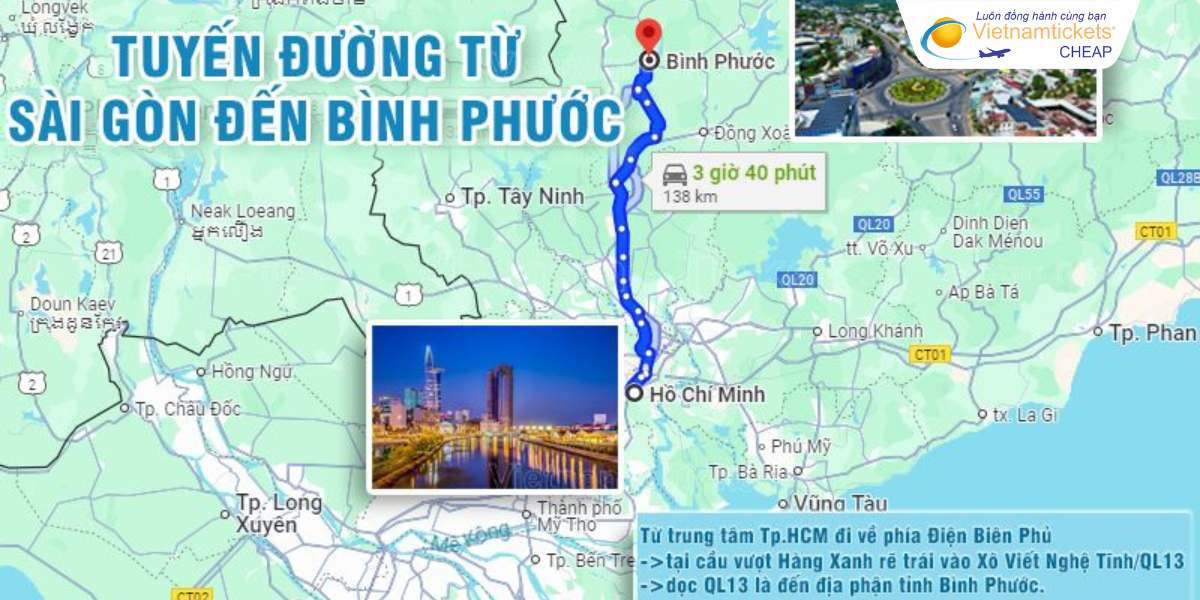 Bản đồ các tuyến đường chính từ Sài Gòn đến Bình Phước, giúp người đọc hình dung rõ lộ trình di chuyển.