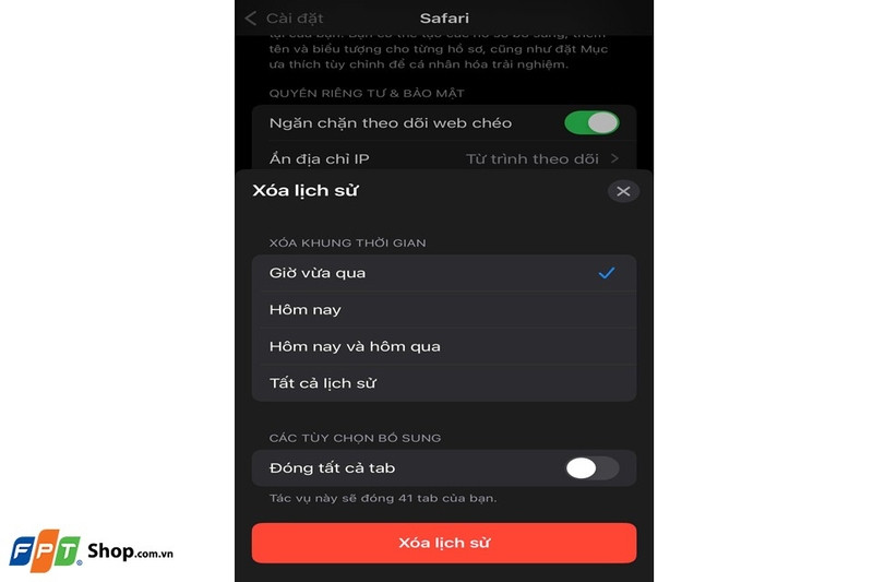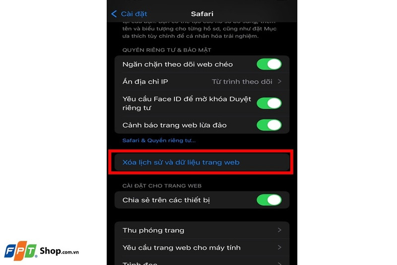 Màn hình cài đặt Safari trên iPhone, hiển thị tùy chọn "Xóa lịch sử và dữ liệu trang web"