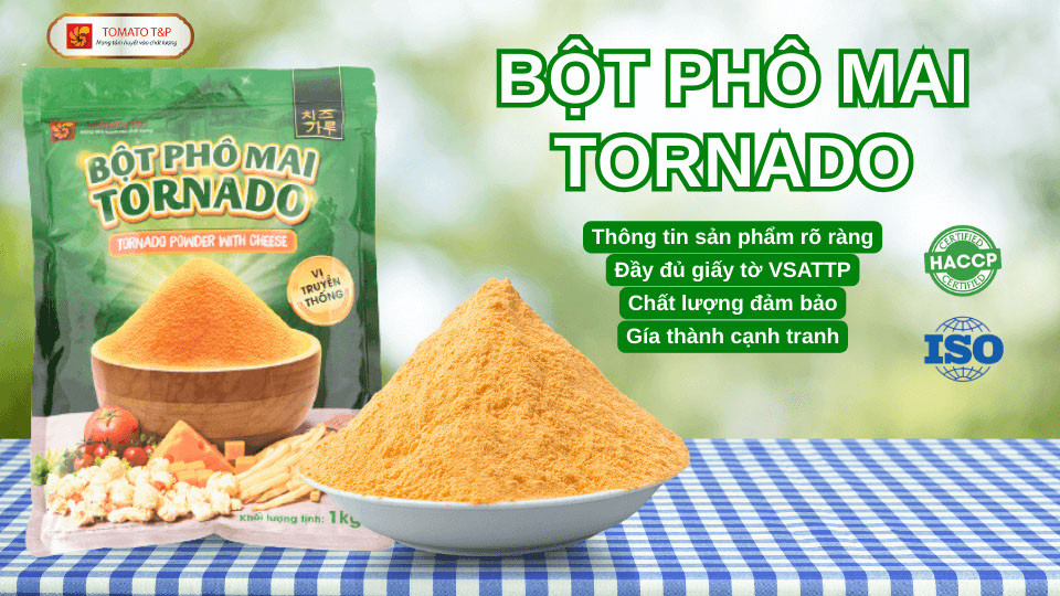 Giữa một thị trường đa dạng với vô vàn đơn vị cung cấp bột phô mai, việc lựa chọn một sản phẩm uy tín và chất lượng cao thực sự không hề đơn giản. Vì thế, người tiêu dùng cần phải hết sức sáng suốt và cẩn trọng khi đưa ra quyết định mua sắm, nhằm bảo vệ sức khỏe cho bản thân và gia đình. Công ty TOMATO T&P tự hào là một trong những nhà cung ứng tiên phong trong lĩnh vực nhập khẩu, sản xuất và phân phối dòng sản phẩm bột phô mai thương hiệu Tornado, với chất lượng hàng đầu tại thị trường Việt Nam.