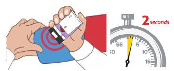 - Bước 3: Đặt đầu đen của Auvi-Q vào vị trí giữa và mặt ngoài của đùi. Sau đó đẩy mạnh vào đùi cho đến khi nghe tiếng “cạch” và giữ trong 2 giây.