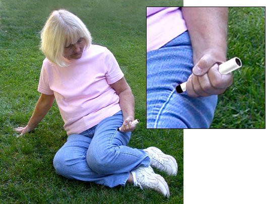 Minh họa cách sử dụng bút tiêm adrenalin tự động qua lớp quần dày