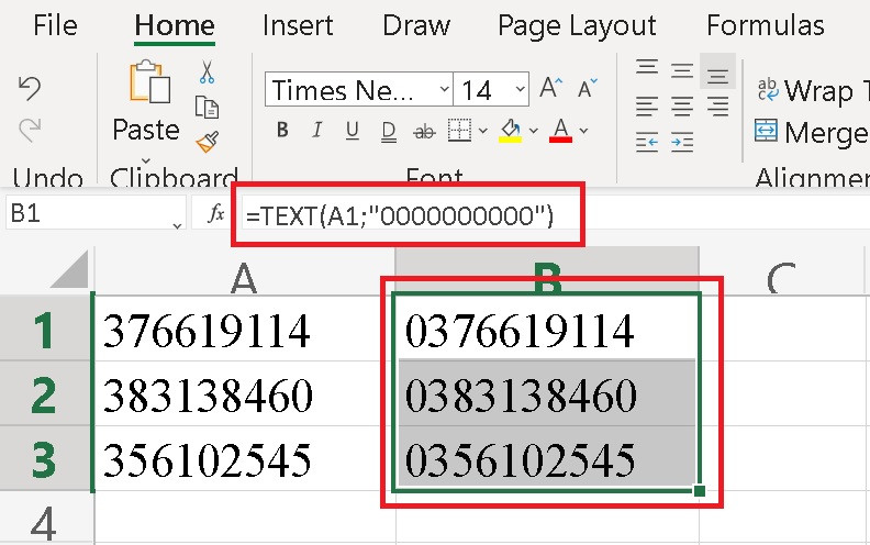 Ví dụ: Nếu bạn muốn tất cả các số của mình có độ dài 10 ký tự, và chèn số 0 vào đầu nếu số đó ít hơn 10 ký tự, bạn có thể sử dụng công thức: =TEXT(A1, "0000000000").