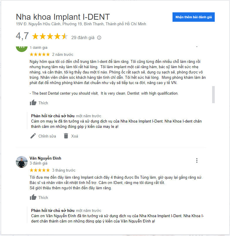 Đánh giá và phản hồi từ những bệnh nhân đã trải nghiệm dịch vụ là một trong những yếu tố quan trọng nhất để nhận biết một nha khoa trồng răng implant uy tín. Bạn có thể tham khảo ý kiến từ khách hàng cũ thông qua nhiều kênh khác nhau. Tìm kiếm tên nha khoa trên Google Maps để đọc các nhận xét, tham gia các nhóm cộng đồng về nha khoa trên Facebook, hoặc hỏi thăm ý kiến từ bạn bè, người thân đã từng cấy ghép implant. Những trải nghiệm thực tế này sẽ cung cấp cái nhìn khách quan và chân thực nhất về chất lượng dịch vụ, thái độ phục vụ và kết quả điều trị của nha khoa. Với sáu tiêu chí đánh giá này, hy vọng bạn có thể lựa chọn cho mình một nha khoa trồng răng implant tốt để thực hiện cấy ghép implant sớm nhất, tránh để trống răng quá lâu gây ra nhiều biến chứng nguy hiểm cho sức khỏe răng miệng và toàn bộ cơ thể.
