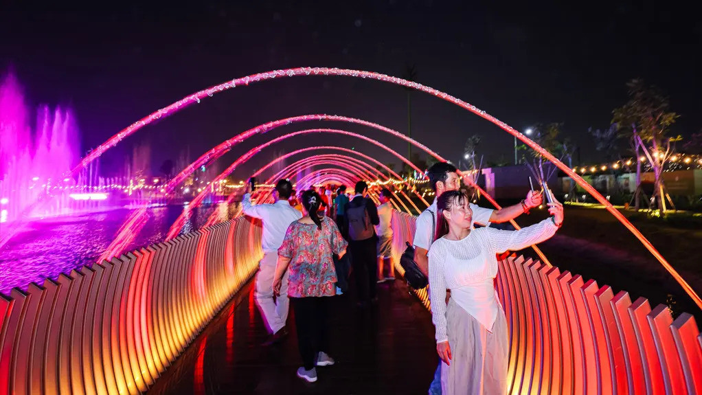 Du khách có thể check-in sống ảo, dạo bộ, hẹn hò, và đặc biệt là thưởng thức các buổi biểu diễn nhạc nước miễn phí vào cuối tuần. Xung quanh cầu còn có nhiều nhà hàng, quán cà phê và cửa hàng mua sắm.