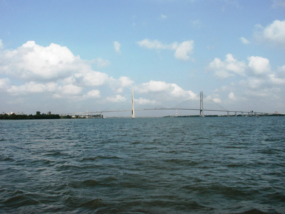 Dòng sông Tiền chảy dưới chân cầu Mỹ Thuận, tạo cảnh quan hữu tình