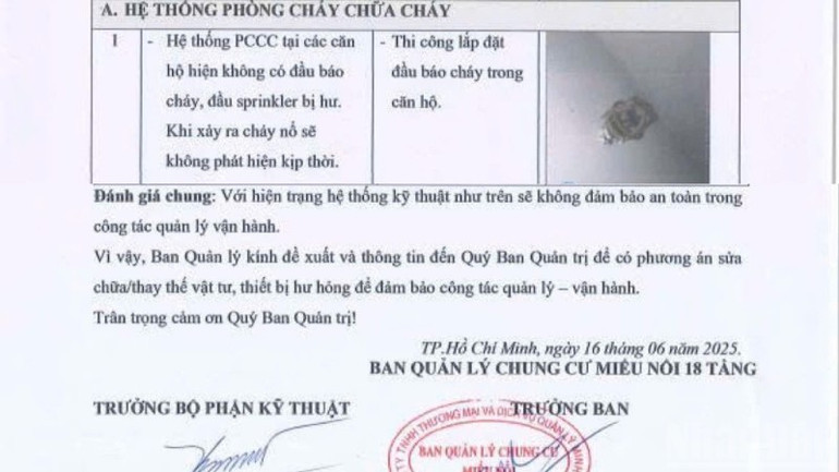 Ban quản lý chung cư đã tận dụng cả lối đi chung và khu vực thoát hiểm để làm nơi giữ xe cho cư dân và khách vãng lai, cả ngày lẫn đêm. Điều này làm cho lối đi vốn đã chật chội nay càng thêm hẹp, gây khó khăn cực lớn cho xe cứu hỏa khi cần tiếp cận hiện trường trong trường hợp khẩn cấp. Kết quả kiểm tra sơ bộ của Công ty Minh Phúc vào tháng 6 năm 2025 cho thấy, hệ thống phòng cháy chữa cháy chung cư Miếu Nổi 18 tầng không đạt yêu cầu ở nhiều hạng mục quan trọng, cho thấy sự buông lỏng quản lý đã tạo ra những lỗ hổng an toàn nghiêm trọng.