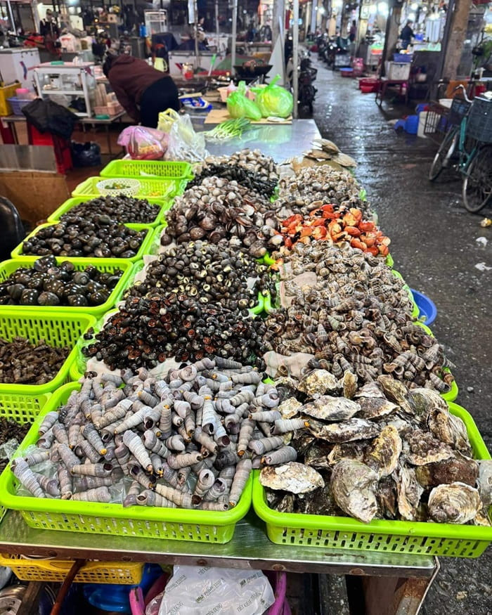 Gian hàng hải sản tươi sống tấp nập tại chợ Cát Bi Hải Phòng, với đa dạng các loại hải sản