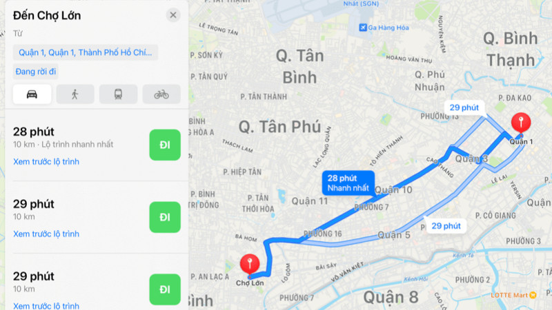 Bản đồ minh họa quãng đường di chuyển từ Quận 1 đến khu Chợ Lớn Sài Gòn