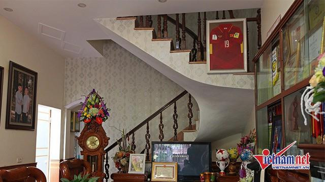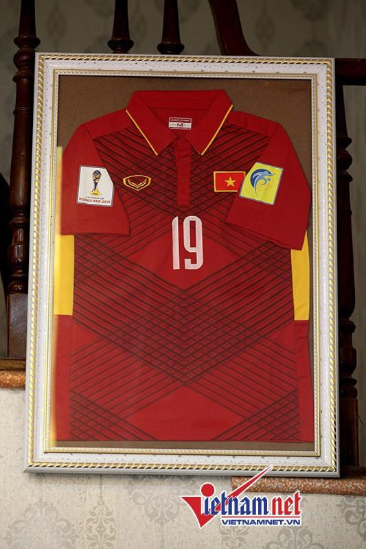 Khi bước vào không gian bên trong ngôi nhà của Quang Hải, điều đầu tiên thu hút ánh nhìn là phòng khách được bài trí vô cùng trang trọng. Trên tường, các huy chương, giải thưởng danh giá cùng những bài báo viết về sự nghiệp của Quang Hải được trưng bày một cách tự hào. Đây không chỉ là nơi sinh hoạt mà còn là một “bảo tàng” mini, ghi dấu những cột mốc quan trọng trong sự nghiệp thể thao của anh. Một chiếc áo số 19, số áo mà Quang Hải thường mặc khi khoác áo đội tuyển quốc gia, cũng được trưng bày như một biểu tượng.