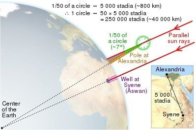 Eratosthenes sử dụng phương pháp đo đạc bóng của một cây gậy tại Alexandria và so sánh với việc không có bóng tại giếng Syene vào buổi trưa ngày hạ chí. Dựa vào góc chiếu sáng mặt trời và khoảng cách giữa hai thành phố, ông đã áp dụng hình học để suy ra chu vi Trái Đất.