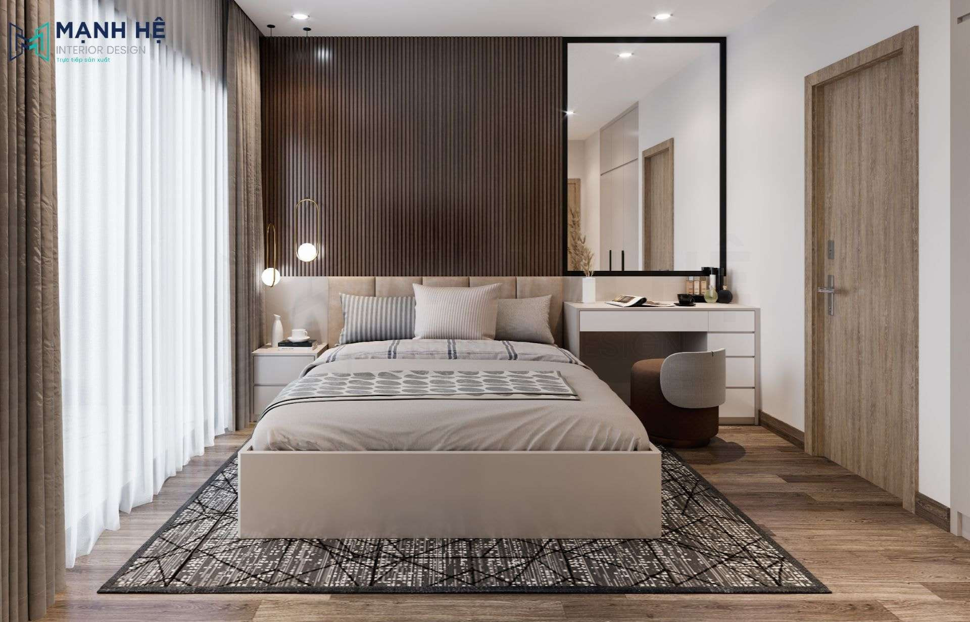 Phòng ngủ master là không gian riêng tư của chủ nhân căn hộ, do đó các kiến trúc sư thường ưu tiên các món nội thất cao cấp và thiết kế cá nhân hóa. Giường ngủ kích thước lớn như 1m8 x 2m hoặc 2m x 2m2, làm từ gỗ tự nhiên hoặc gỗ công nghiệp kết hợp da, nỉ cao cấp, sẽ mang lại sự thoải mái tối đa.