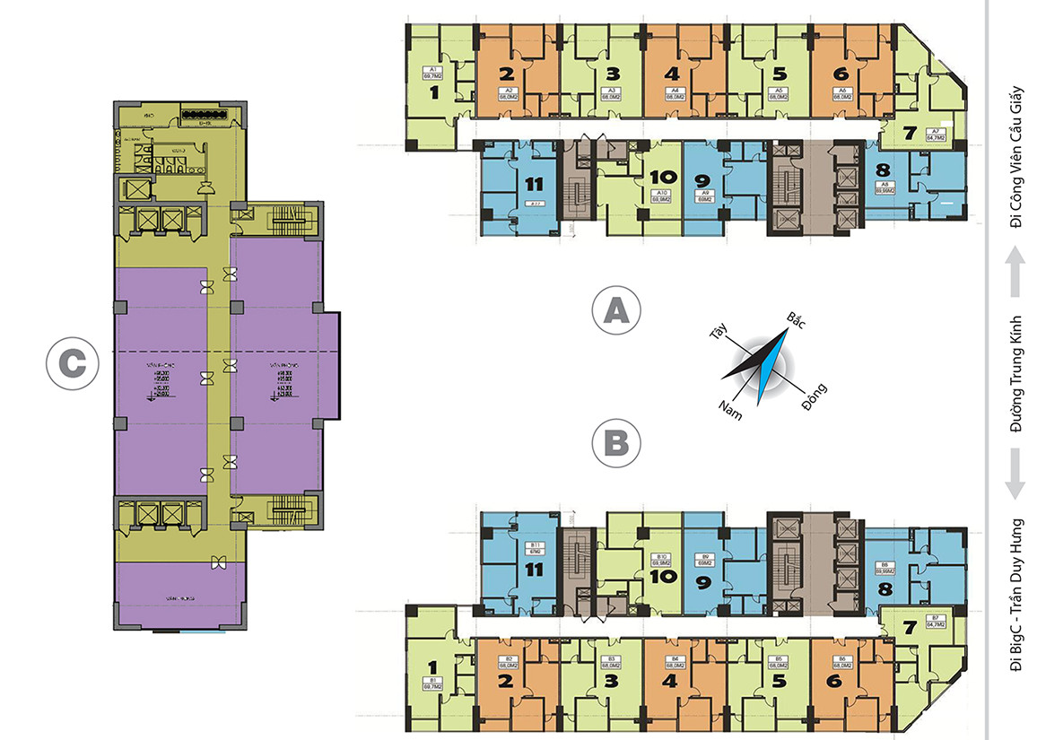 Dự án chung cư 219 Trung Kính cung cấp đa dạng các loại mặt bằng căn hộ với diện tích khác nhau, đáp ứng nhu cầu đa dạng của khách hàng. Trên một mặt sàn điển hình, có 11 căn hộ với các diện tích cụ thể như 64.7 m2, 68m2, 69.9m2, 71m2 và 74m2. Mỗi loại diện tích đều được thiết kế để tối đa hóa công năng và mang lại sự thoải mái tối đa cho cư dân.