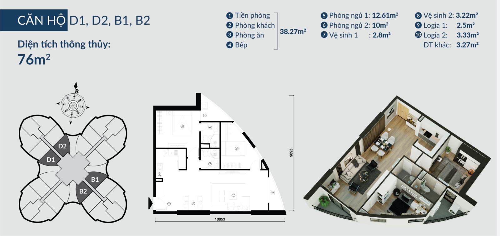 Dự án cung cấp đa dạng các loại hình căn hộ từ 2 đến 3 phòng ngủ, với diện tích linh hoạt từ 75.8m2 đến 102m2, cùng với các căn Penthouse đẳng cấp.