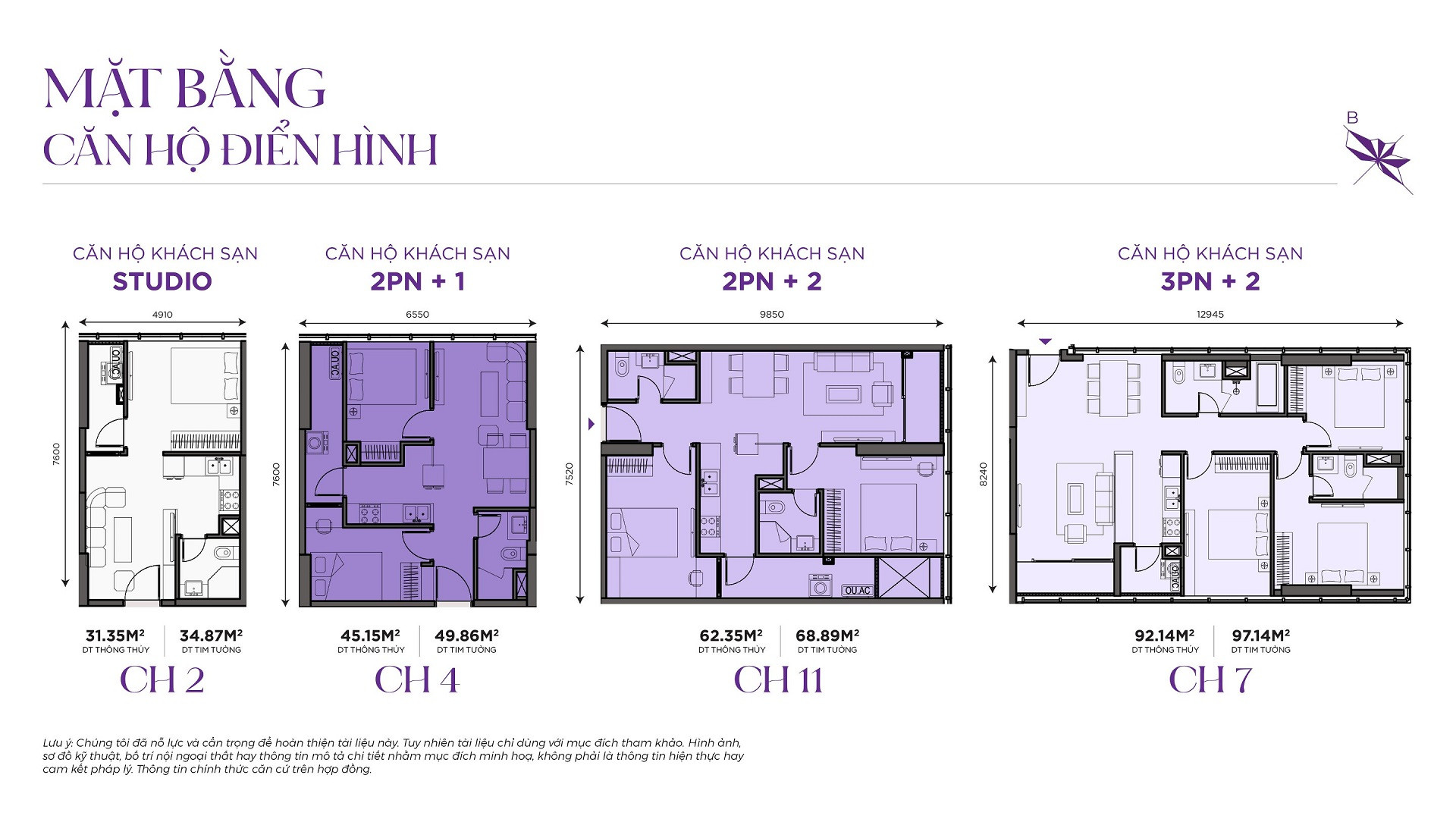 Các loại hình căn hộ với diện tích cụ thể bao gồm: