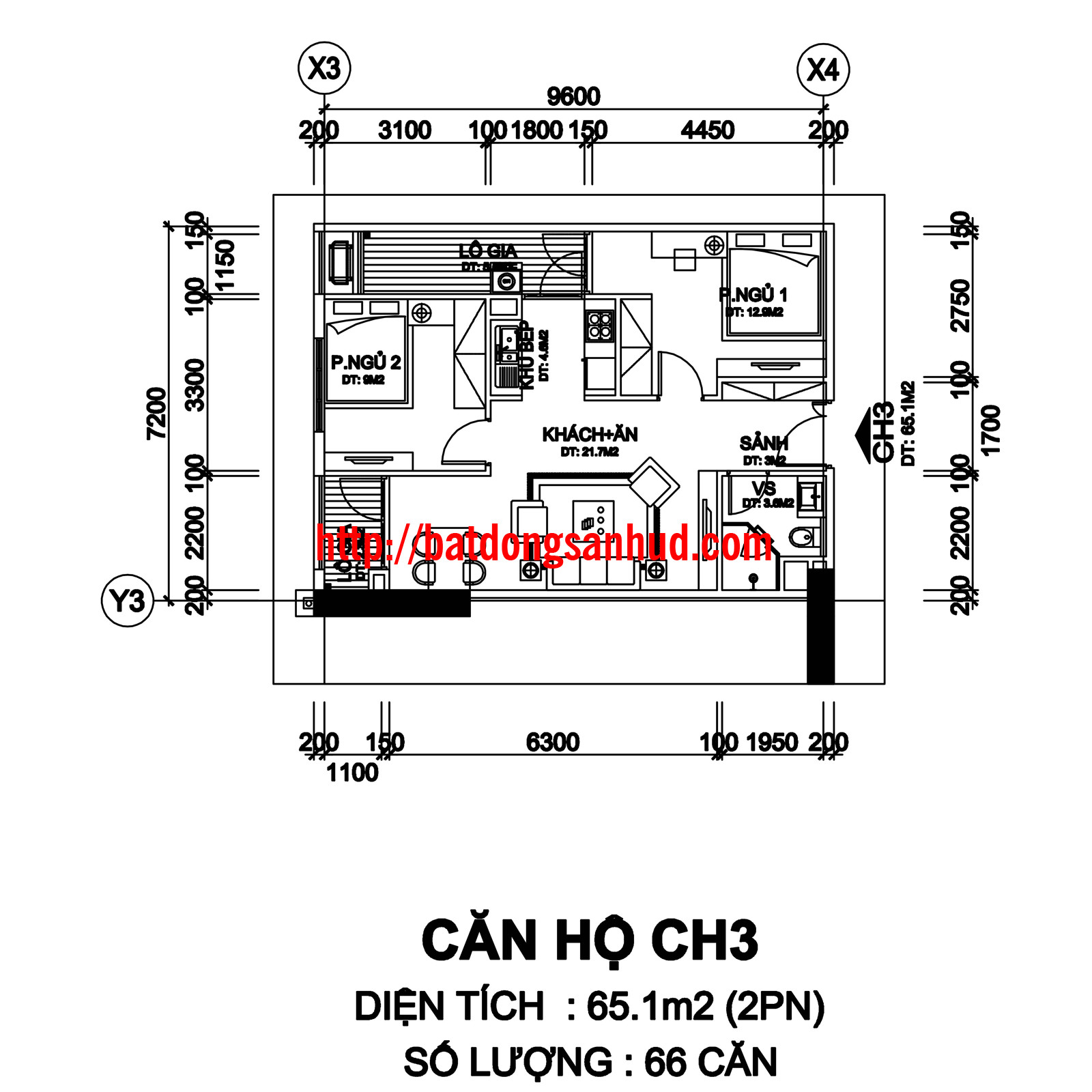 • Căn hộ CH3: được thiết kế 2 phòng ngủ với diện tích 65,1m2, gồm 66 căn, phù hợp cho gia đình nhỏ hoặc những cặp đôi.