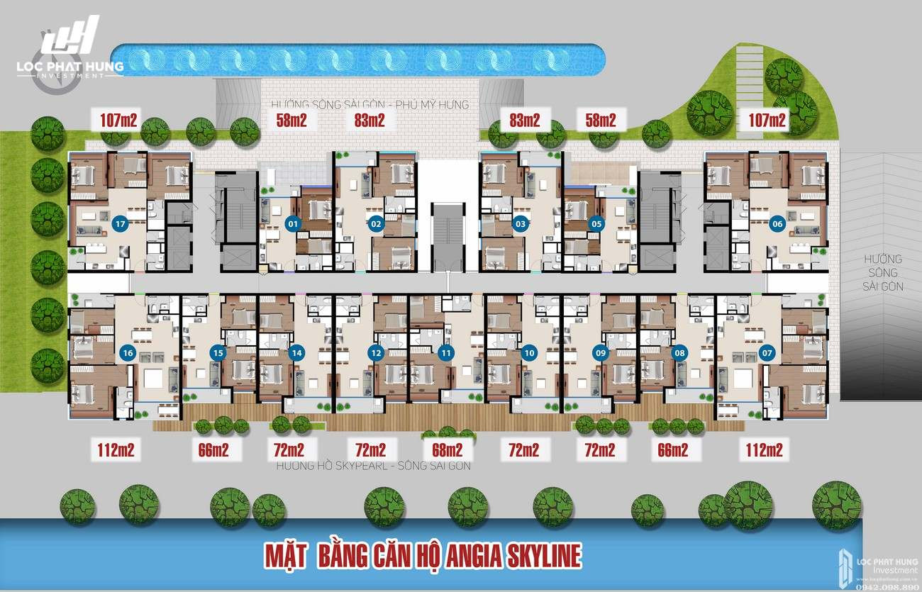 Mặt bằng tầng điển hình từ tầng 3 đến tầng 35 được thiết kế với số lượng căn hộ vừa phải trên mỗi tầng, đảm bảo mật độ dân cư hợp lý. Các hành lang rộng rãi, thông thoáng giúp lưu thông không khí và ánh sáng. Sự chăm chút của chủ đầu tư An Gia Investment đến từng chi tiết nhỏ trong thiết kế giúp mỗi căn hộ An Gia Skyline trở thành một “resort giữa lòng thành phố”, nơi cư dân có thể cảm nhận sự thoáng đãng từ Công viên Biển Sông và sự tráng lệ của Hồ Skypearl mỗi khi trở về nhà.