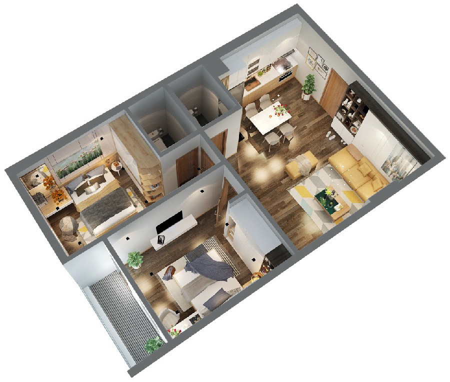 Các căn hộ 2 phòng ngủ được thiết kế với nhiều góc nhìn khác nhau, đảm bảo sự thông thoáng và tận dụng ánh sáng tự nhiên. Ví dụ, các căn góc thường có lợi thế về diện tích và tầm nhìn rộng hơn. Thiết kế nội thất tuy đơn giản nhưng vẫn đảm bảo công năng sử dụng tối đa cho từng không gian sống nhỏ.