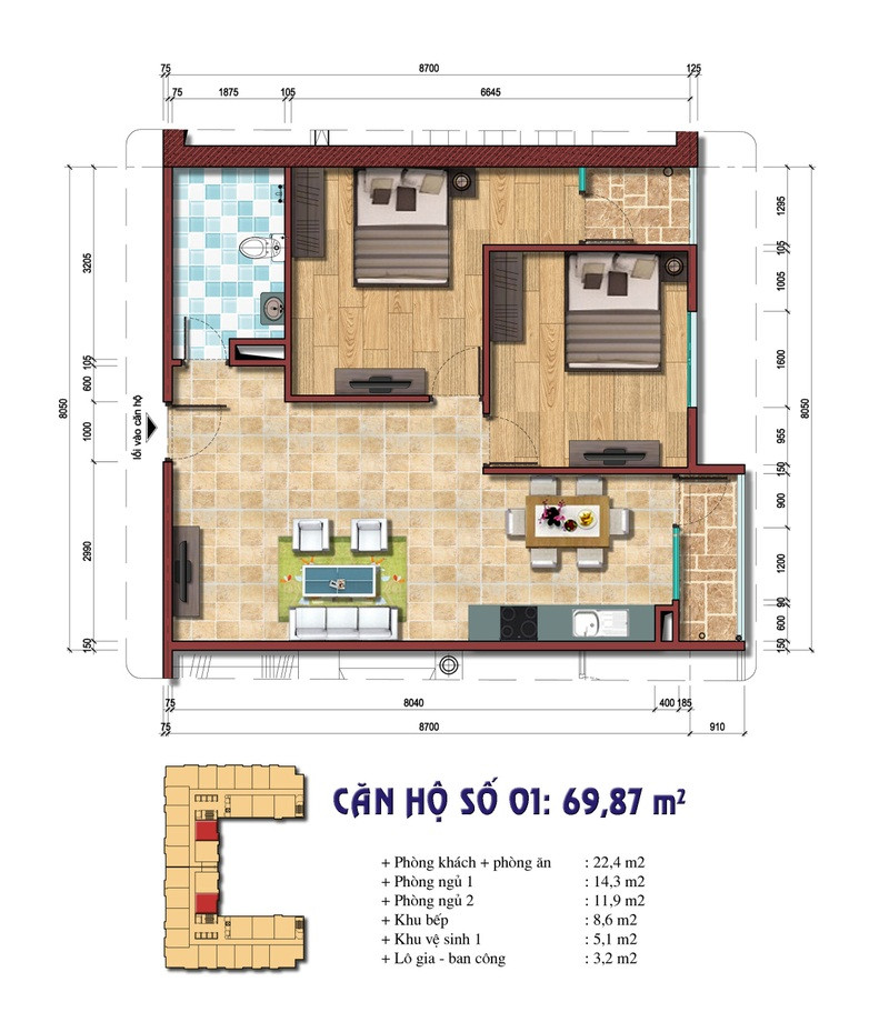 - Căn hộ diện tích 69,87m2