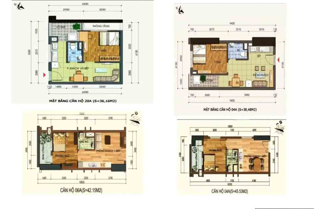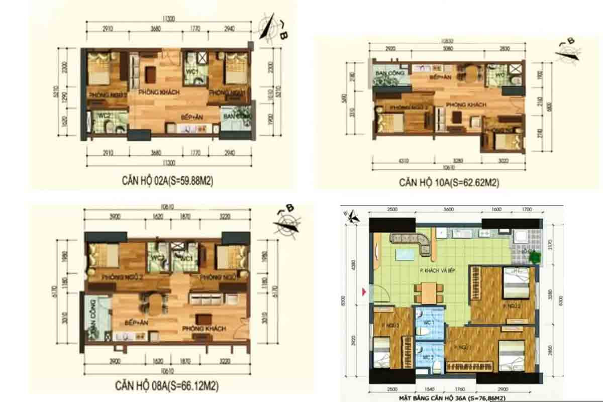 Các căn hộ có diện tích đa dạng từ 36m2, 38m2, 42m2, 45m2, 47m2, 54m2 (1 phòng ngủ) đến 55m2, 58m2, 59m2, 62m2, 66m2 (2 phòng ngủ) và 76m2 (3 phòng ngủ).