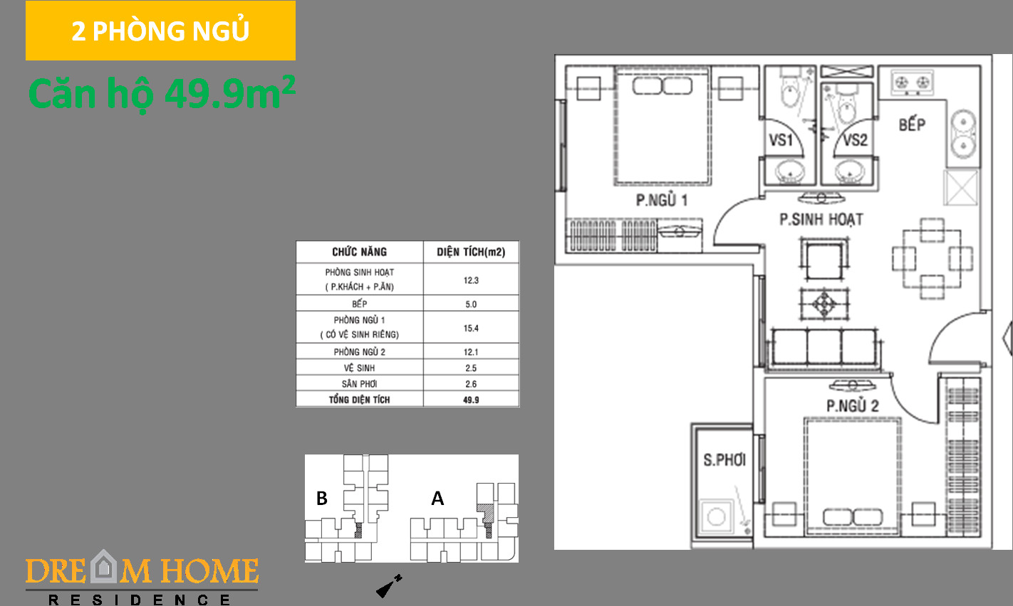 Sơ đồ mặt bằng căn hộ DreamHome Residence Gò Vấp diện tích 49.9m2