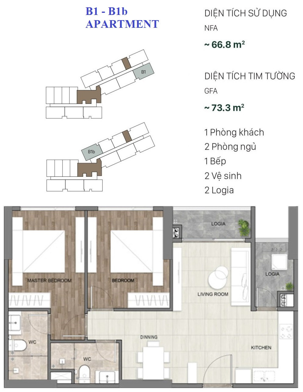 Thiết kế căn hộ 2 phòng ngủ mẫu B1-B1b tại Eco Xuân Lái Thiêu