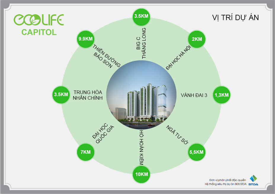 Xung quanh dự án Ecolife Capitol là một quần thể các khu đô thị mới phát triển năng động như Khu đô thị Trung Văn, Khu đô thị mới Phùng Khoang. Đặc biệt, cư dân còn được hưởng lợi từ không gian xanh rộng lớn của các công viên cây xanh và hồ điều hòa trong khu vực lân cận, mang đến một môi trường sống trong lành. Hệ thống giao thông công cộng cũng rất phát triển với tuyến Bus BRT Kim Mã – Yên Nghĩa hoạt động tần suất cao, chỉ từ 2-5 phút/lượt, giúp việc di chuyển trở nên dễ dàng và nhanh chóng hơn bao giờ hết.