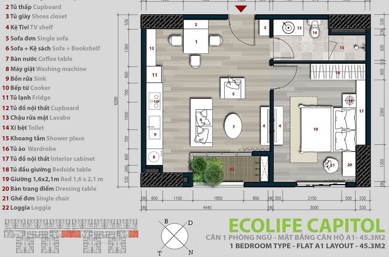 Mặt bằng căn hộ 1 phòng ngủ tại chung cư Ecolife Tố Hữu tối ưu không gian sống