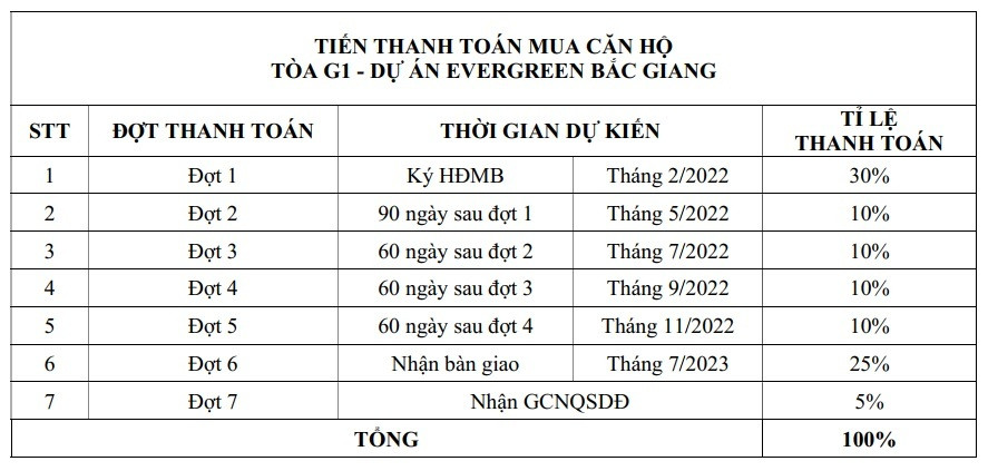 Tiến Độ Thanh Toán Linh Hoạt Của Chung Cư Evergreen Bắc Giang