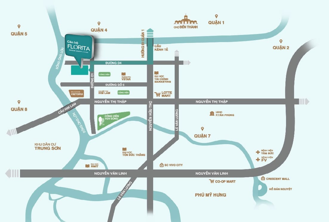 Chung cư Florita Quận 7 tọa lạc tại khu dân cư Him Lam, phường Tân Hưng, Quận 7, TP.HCM, ngay mặt tiền đường D1 và D4. Vị trí này kết nối nhanh chóng đến Quận 1, Quận 4, Quận 5 và khu đô thị Phú Mỹ Hưng.