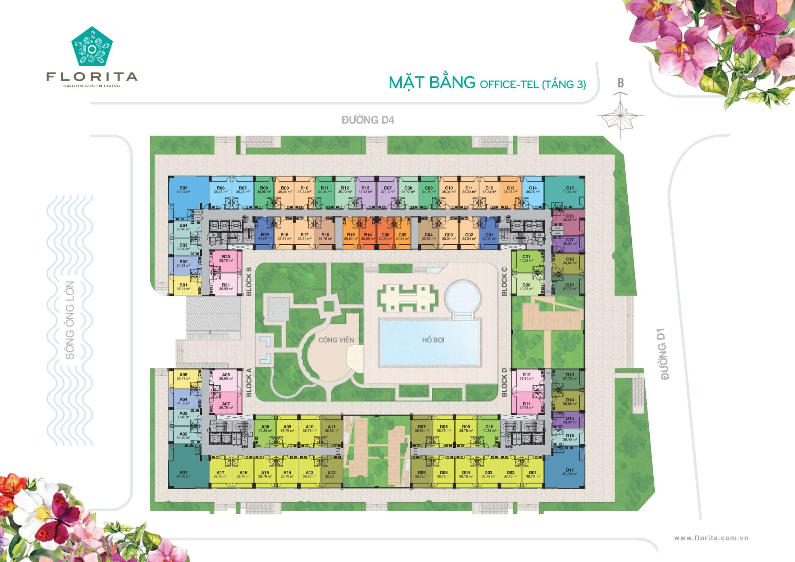 Dự án bao gồm 4 block căn hộ (ký hiệu A, B, C, D), mỗi block cao 19 tầng cùng với 1 tầng hầm rộng rãi, đáp ứng nhu cầu đỗ xe cho toàn bộ cư dân. Tổng số căn hộ tại Florita là 570 căn, với đa dạng các loại hình từ 1 đến 3 phòng ngủ, phù hợp với nhiều đối tượng khách hàng khác nhau. Bên cạnh đó, dự án còn cung cấp 76 căn officetel linh hoạt và 40 căn shophouse thương mại ở tầng trệt, tạo nên một hệ sinh thái dịch vụ tiện lợi ngay trong khuôn viên, phục vụ tối đa nhu cầu của cộng đồng.