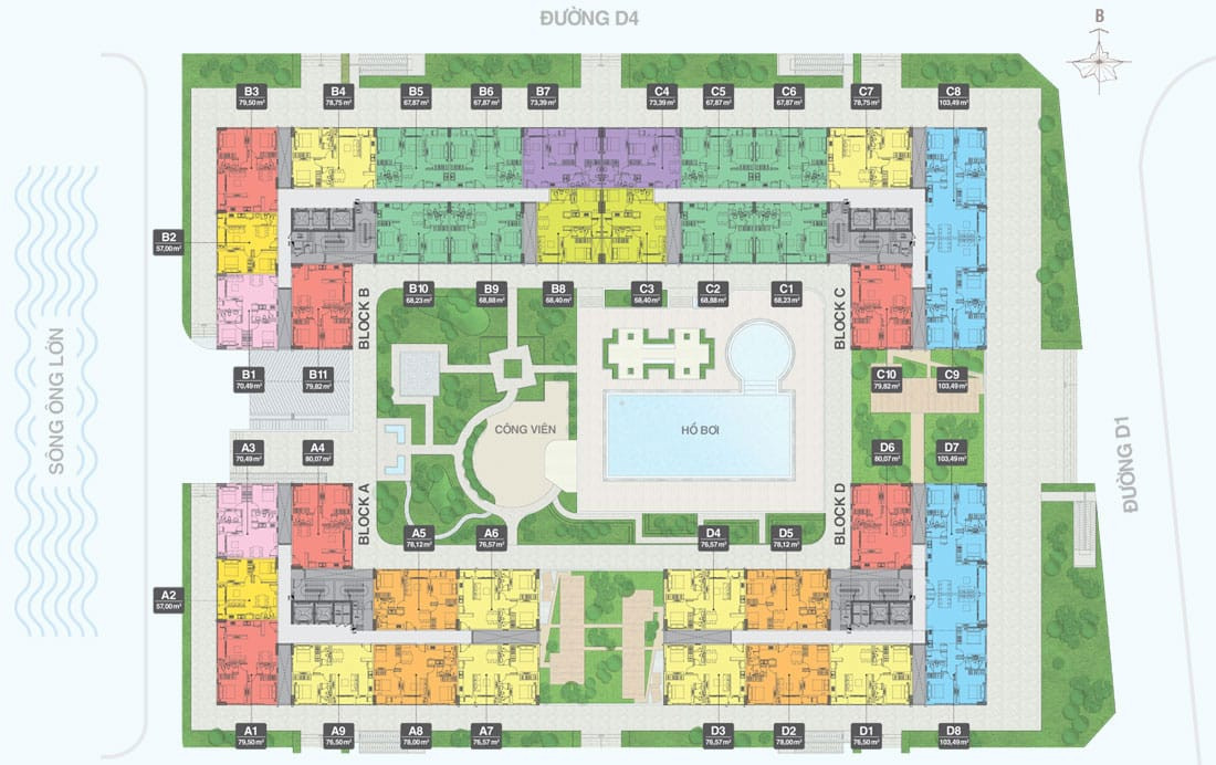 Cụ thể, các căn hộ 1 phòng ngủ (diện tích khoảng 48-56 m²) phù hợp cho người độc thân hoặc vợ chồng mới cưới. Căn hộ 2 phòng ngủ (diện tích từ 68-73 m²) là lựa chọn phổ biến cho các gia đình trẻ, với bố cục hợp lý, các phòng ngủ cách biệt, bếp thoáng và khu giặt phơi riêng. Các căn 3 phòng ngủ (diện tích khoảng 95-103 m²) thường là căn góc, có hai mặt thoáng, phòng khách rộng nối liền ban công, lý tưởng cho gia đình đa thế hệ hoặc những ai yêu thích không gian sống rộng rãi, sang trọng.